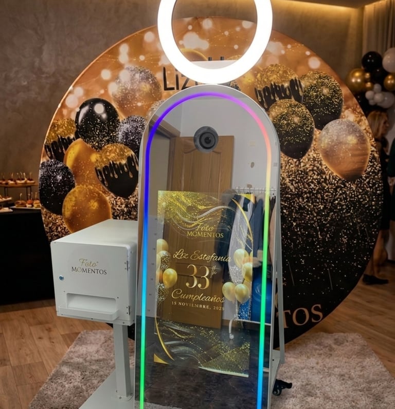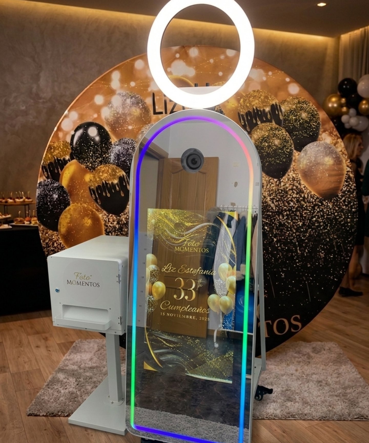 Nuestro fotomatón espejo es la opción más elegante y llamativa para cualquier evento. Con su pantalla táctil de 32 pulgadas y diseño tipo espejo, ofrece una experiencia interactiva que sorprende a todos los invitados desde el primer momento. Permite hacerse fotos de forma intuitiva, divertida y totalmente personalizada, creando un ambiente único en bodas, celebraciones y eventos exclusivos. Ideal para quienes buscan un servicio moderno, visual y diferente que marque la diferencia.
